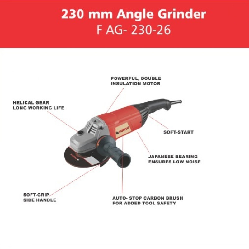 The FORTe angle grinder is a powerful and robust tool that can handle heavy-duty cutting, grinding and sanding tasks. It has a 2600-watt motor that delivers a high no-load speed of 6500 rpm, ensuring fast and smooth cutting. The disc diameter is 230 mm, which is ideal for cutting large and hard materials. The spindle diameter is M14, which ensures a secure and stable connection of the accessories. The angle grinder weighs 5.7 kg, making it sturdy and durable. It also has additional features such as double insulation, soft start for load protection, auto stop carbon brush and two step lock on switch, which make it safe, reliable and convenient. The soft start feature reduces the initial torque and prevents overloading. The auto stop carbon brush feature stops the tool when the carbon brushes are worn out, preventing damage to the motor. The two step lock on switch feature allows you to lock the tool in the on position for continuous operation. Whether you need to cut, grind or sand, the FORTe angle grinder can help you achieve professional results with high performance and safety.