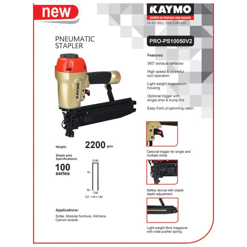 The Kaymo PRO-10050V2  Pneumatic Stapler is a powerful and efficient tool designed for heavy-duty stapling applications. It is widely used in the sofa manufacturing industry and offers several notable features: